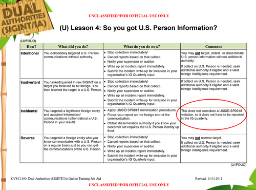 This interpretation of COLLECTION as targeting/reporting rather than interception within USSID-18 is buttressed by the following slide which answers the question what to do if an analyst see's information on a US Person. Notice the difference between 'inadvertent' and 'incidental'.