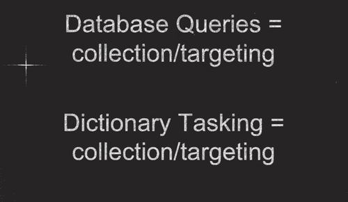 In "searching a database" COLLECTION is happening without interception, since the information in the database existed prior to the requirement. If COLLECTION means targeting and If such databases were built by capturing or intercepting information outside of the intelligence cycle, for example through mass surveillance, such interception may not be counted as a COLLECTION activity. Under this definition the information is only COLLECTED when queries are run against it since COLLECTION only happens when someone or something is targeted to fulfill an intelligence requirement. We term this definition "COLLECTION as targeting'.