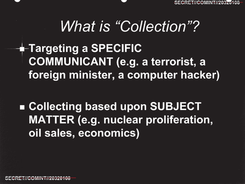 The above slides, leaked by Snowden, from the NSA's Cryptological School Course on Legal, Compliance, and Minimization Procedures, provides a more succinct definition: COLLECTION is targeting within the intelligence cycle8. This definition given in the slide above agrees with the last part of INTELLIGENCE THREAT HANDBOOK's definition of COLLECTION.